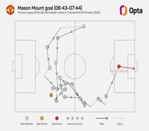 据统计,芒特的这粒进球经历了连续18次传球,这是本赛季英超联赛中进球传递次数并列最多的,也是自2023年9月布鲁诺-费尔南德斯对阵伯恩利(同样为18次)以来,曼联在联赛中进球前传球次数最多的。