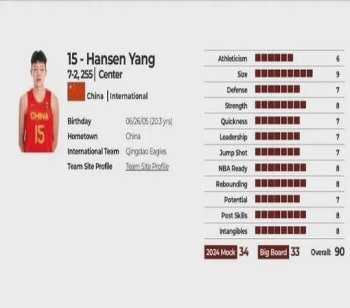 我再放上小杨的数据大家做个对比:掌长25.4厘米,掌宽28.6厘米,裸足身高2米16,臂展2米20,站立摸高2米82,体重114.5公斤,最新NBA官网体重已增长到122.4公斤,变向敏捷测试11秒79、折返跑3秒01、四分之三冲刺3秒38、站立弹跳66厘米、跑动最大弹跳76厘米.